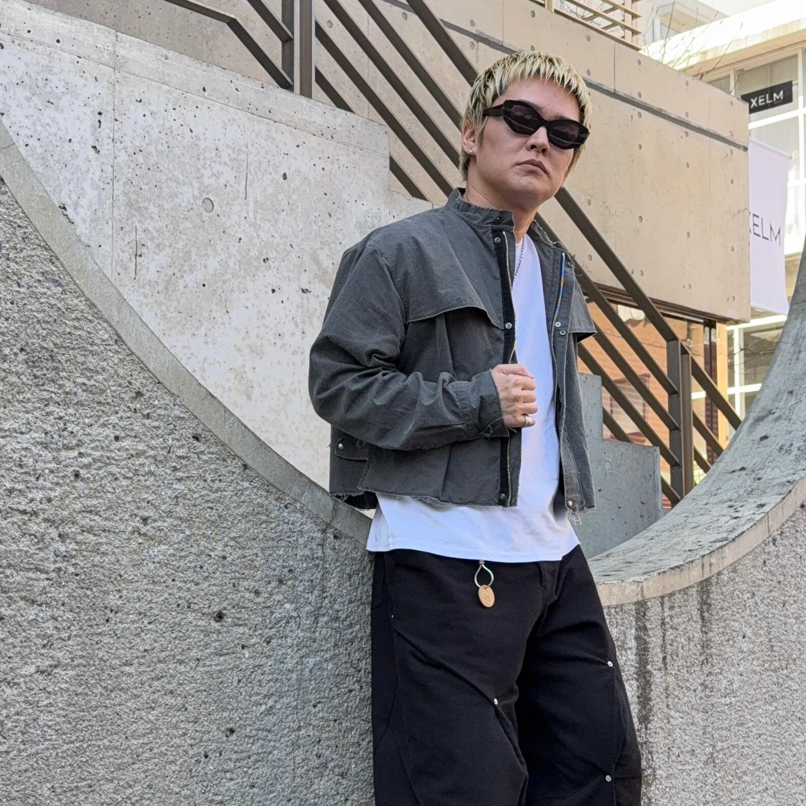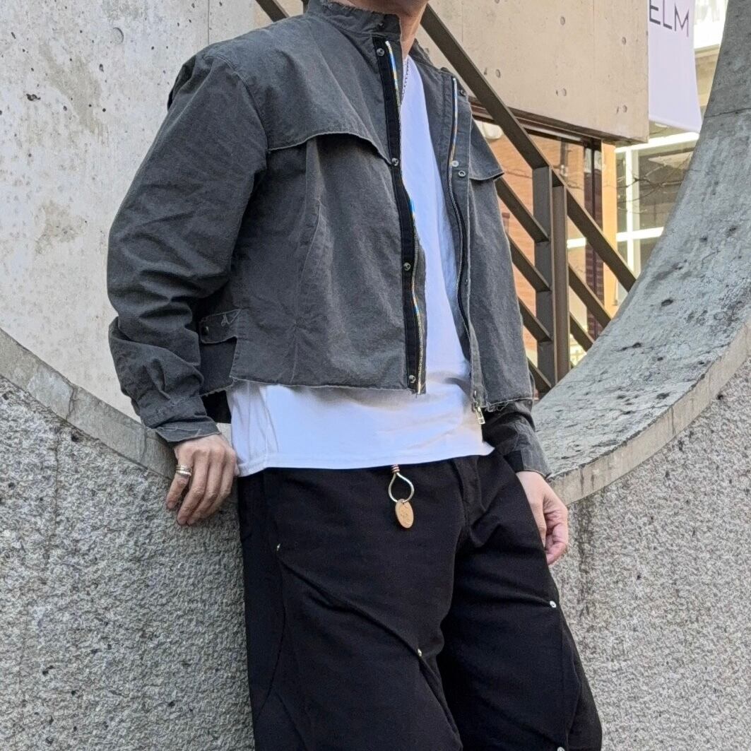特徴としては昨今のトレンド感を存分に表現した短丈仕様、ウオッシュをかけた独特なチャコール(アースカラー)のシャツ素材を使用したシングルライダースジャケット。